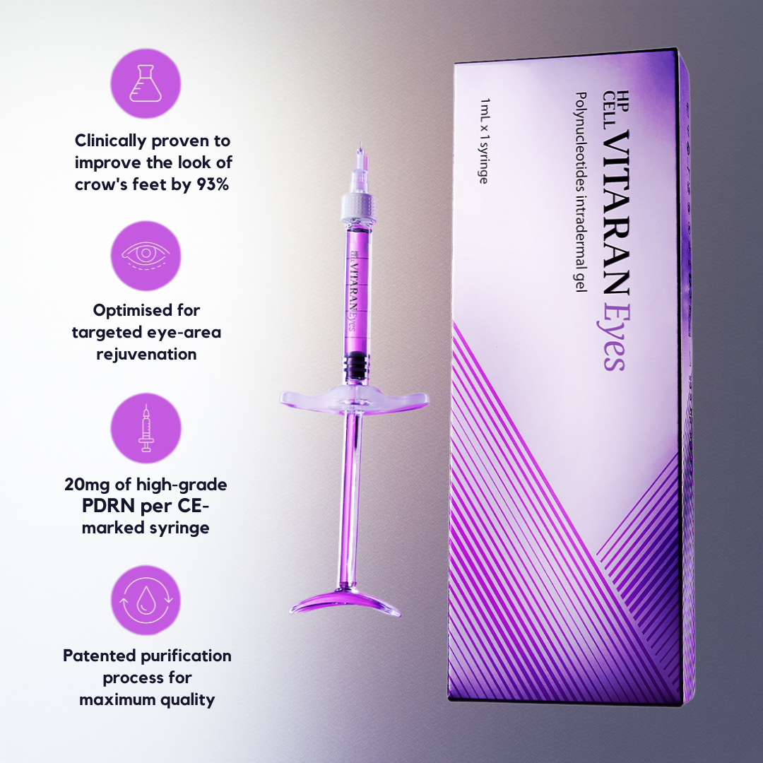 VITARAN Eyes is a bio-stimulating injectable skin booster designed to treat the under eyes area, derived from purified salmon trout DNA.